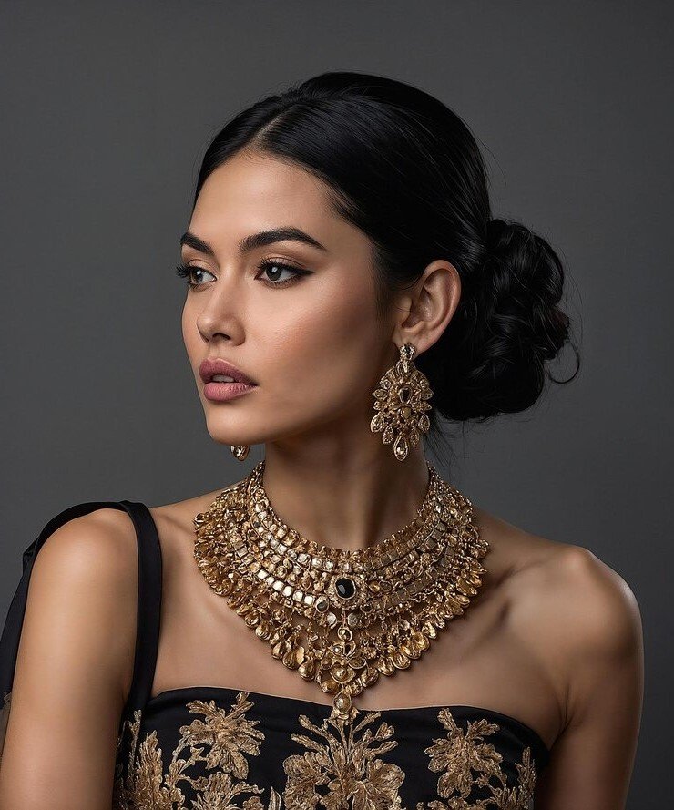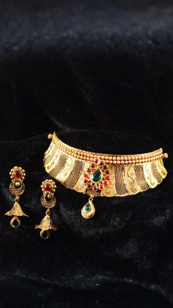 Inspired by the royal courts of Rajputana, this exquisite Kundan choker set is handcrafted by fourth-generation artisans using uncut Polki diamonds set in 22K gold with meenakari reverse enamel work.